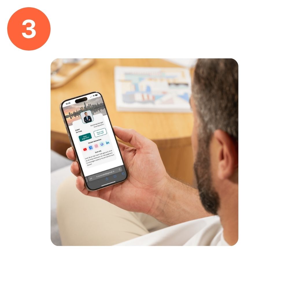 Met de Businesskaart deel je moeiteloos al je gegevens. Eén tik is genoeg: jouw contactinfo verschijnt direct op de telefoon van je nieuwe connectie. Geen gedoe meer met handmatig overtypen. Wel snel, professioneel en blijvend in beeld.